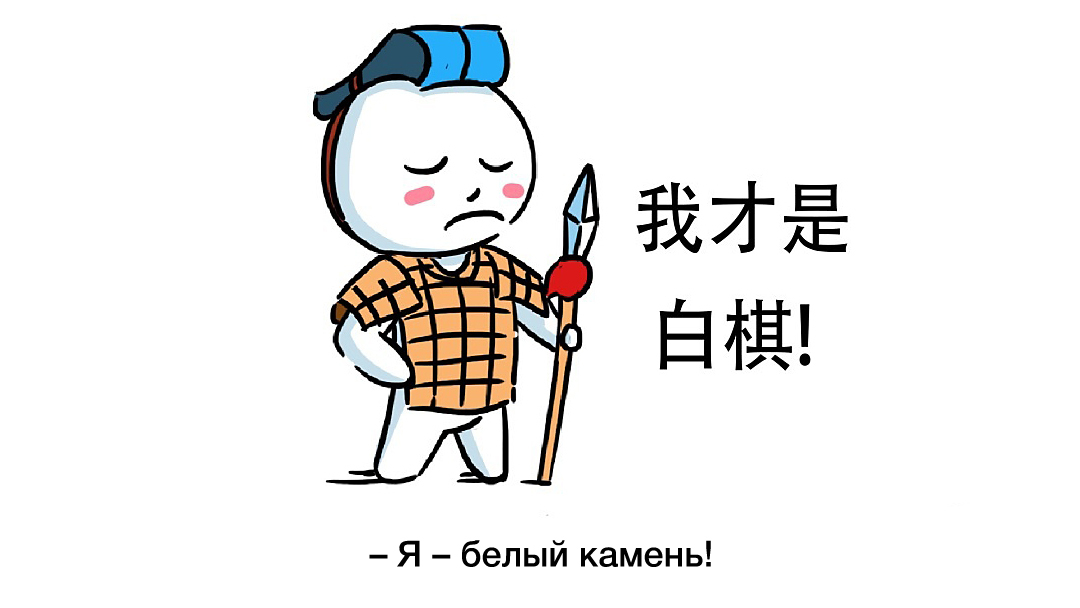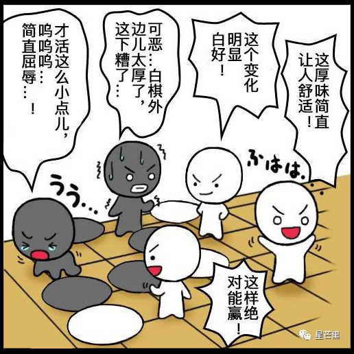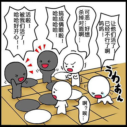 Белые: — Всё пропало, белые столько ходов потратили снаружи, теперь камней очень много… Вот беда! — Пускай чёрные живут, уже ничего нельзя поделать... хнык-хнык… — Что? Увы…